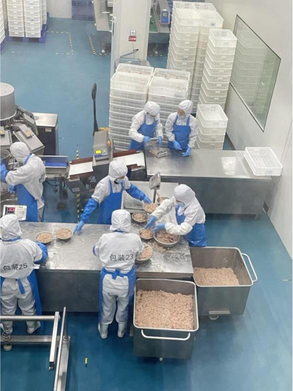 在安徽铜陵的小菜园供应链公司,我们看到了食材加工、料包制作的全过程。工作人员将猪肉、鸡肉等各种原材料依据菜品需要进行分割和预处理,再按照份量分装打包,制作成一个个标准化料包。以小菜园的招牌农家红烧肉为例,所采购的黑猪肉统一在中央工厂进行处理,按照菜品所需大小和规格进行分割,再按份打包。