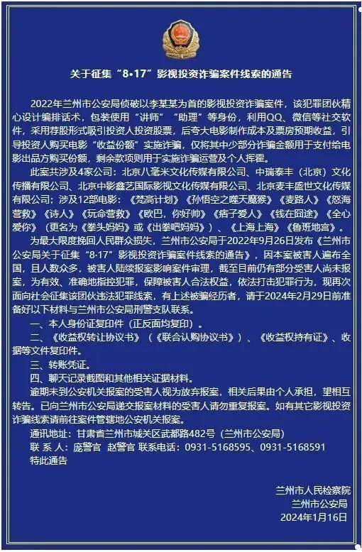 近日,多位明星参演的电影涉影视投资诈骗案,引发关注。1月16日,兰州市人民检察院、兰州市公安局联合发布通告,公开征集“8·17”影视投资诈骗案件线索。