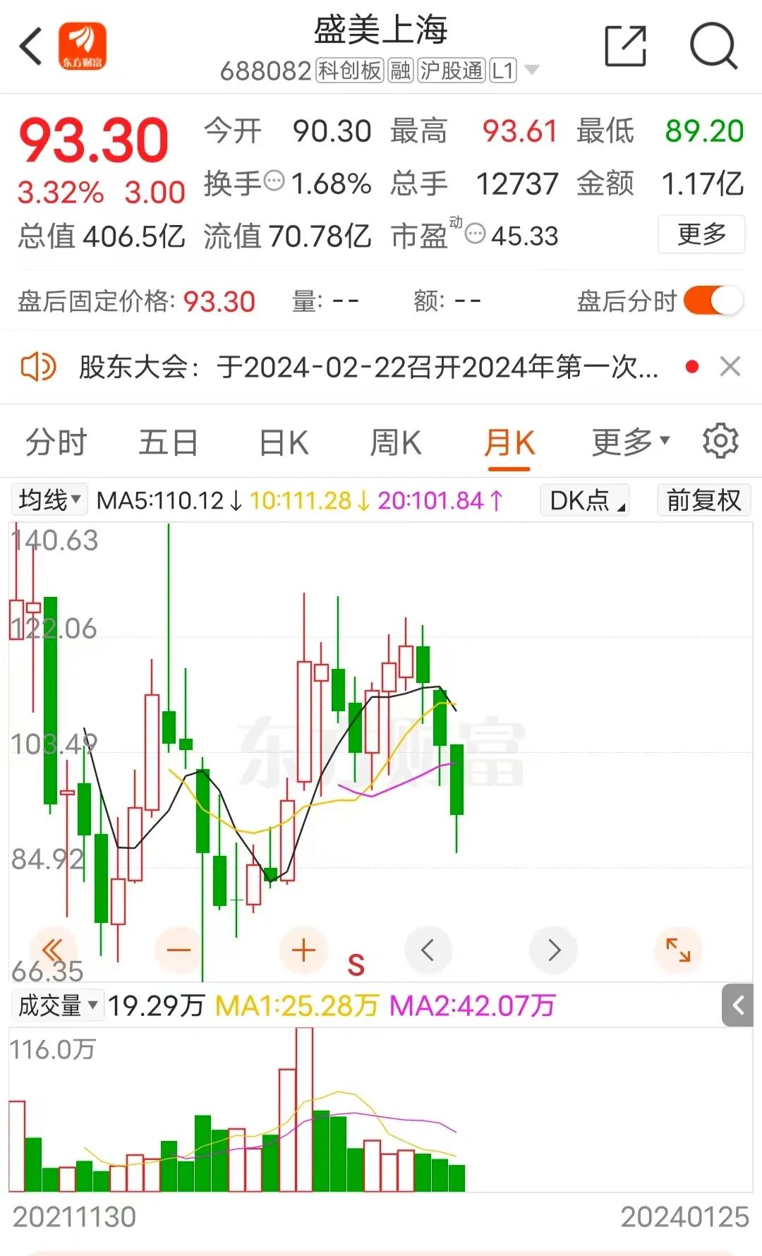 上市以来,盛美上海的股价基本保持了稳定,截至1月25日收报93.3元/股,市值为406.5亿元。