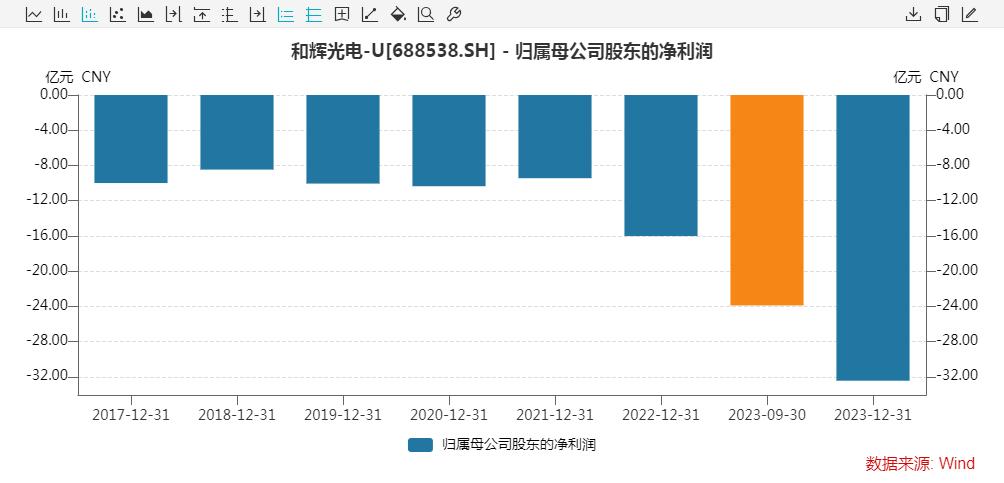 如果2023年最终披露的归母净利润为-32.45亿元,那么,和辉光电2017年至今的8年时间里,累计亏损高达120.71亿元。