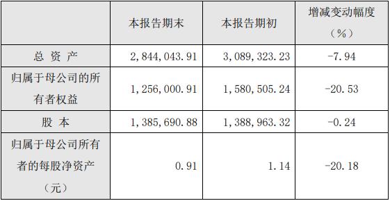 2023年末,公司总资产为284.4亿元,较期初减少7.94%;归属于母公司的所有者权益为125.6亿元,较期初减少20.53%;归属于母公司所有者的每股净资产为0.91元,较期初减少20.18%。