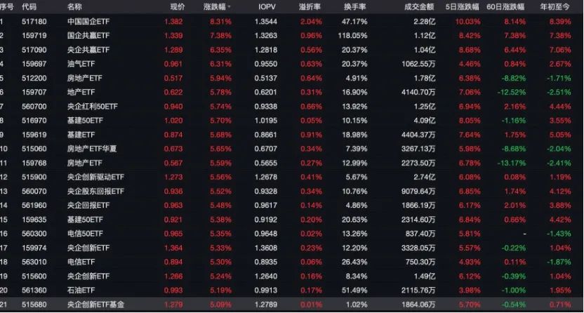 相关个股掀起涨停潮,中国石油自2015年7月以来首次涨停,中国联通、中国交建、中铁装配等超20股涨停。在基金方面,截至收盘,21只国央企主题相关ETF单日涨幅超5%。