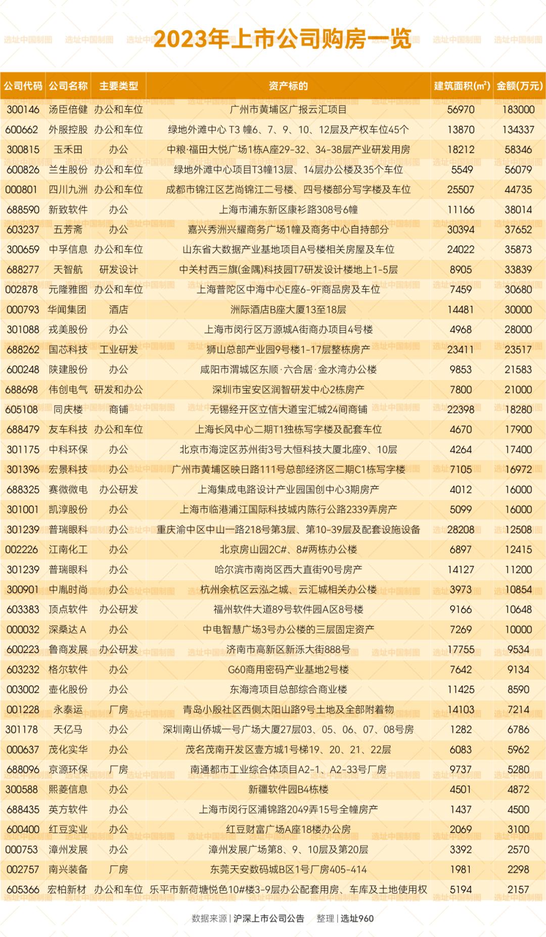 以金额计,排名前三的是:汤臣倍健18.3亿元买入广报云汇项目;外服控股13.87亿元买入绿地外滩中心T3数层办公楼和车位;玉禾田5.83亿元买入中粮∙福田大悦广场1栋A座数层办公楼。最低购房金额为2157万元,系宏柏新材购入江西乐成市的一处办公用房。