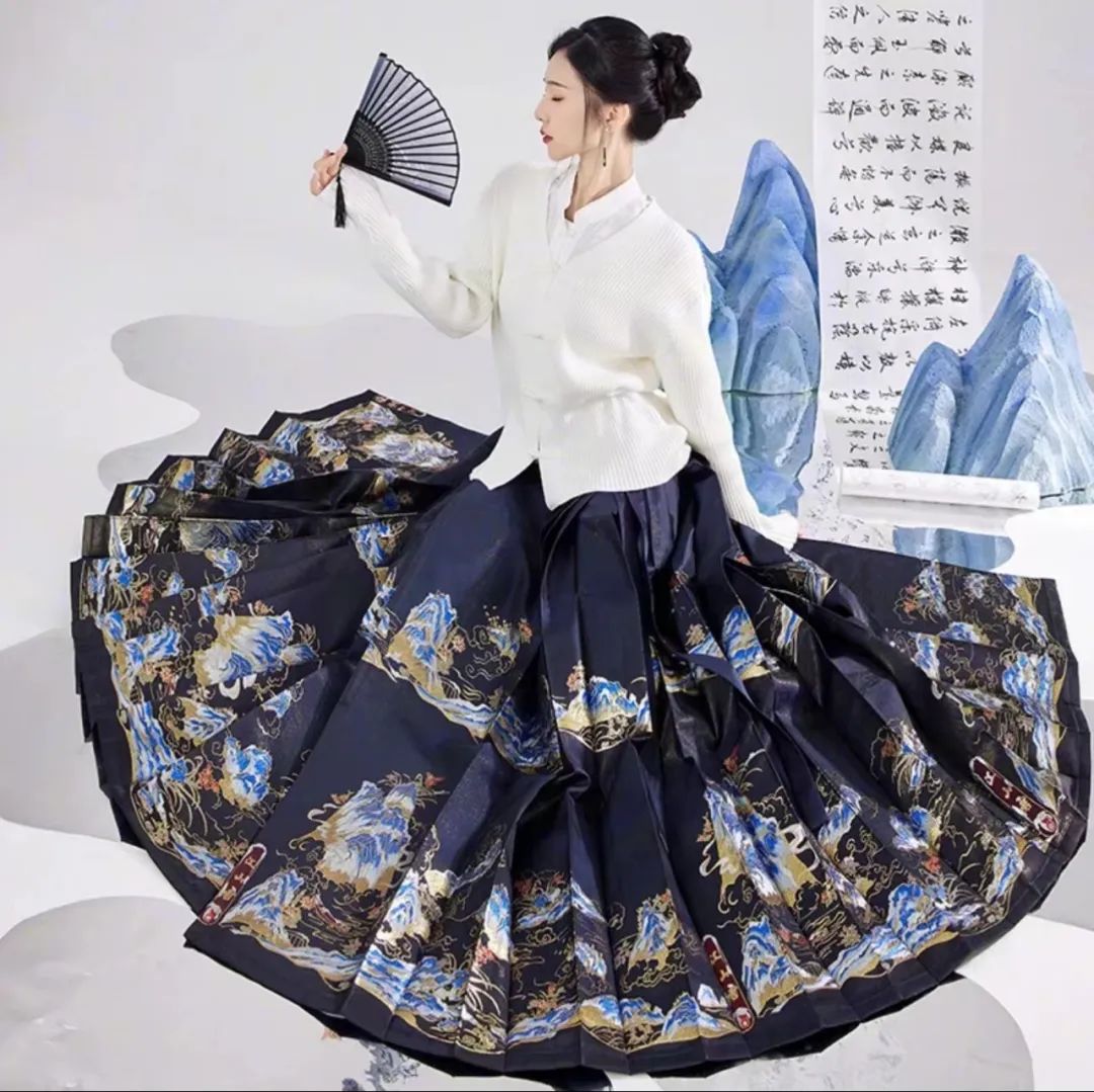 从店铺商品信息来看,星河汉歌原创汉服以售卖新中式汉服的马面裙为主。产品设计上,在星河汉歌将马面裙与南京云锦妆花、点翠等传统非遗技艺进行现代技术的进行改良,通过对机器精准编程,实现织品一体成型成色,优化背面线头多的问题,做出背面平整且图案工整的织品,赋予织品图案更强的立体感,实现规模化生产,延续古代汉服设计特色的同时,结合现代场景,打造在日常生活中也能穿着自如的汉服。