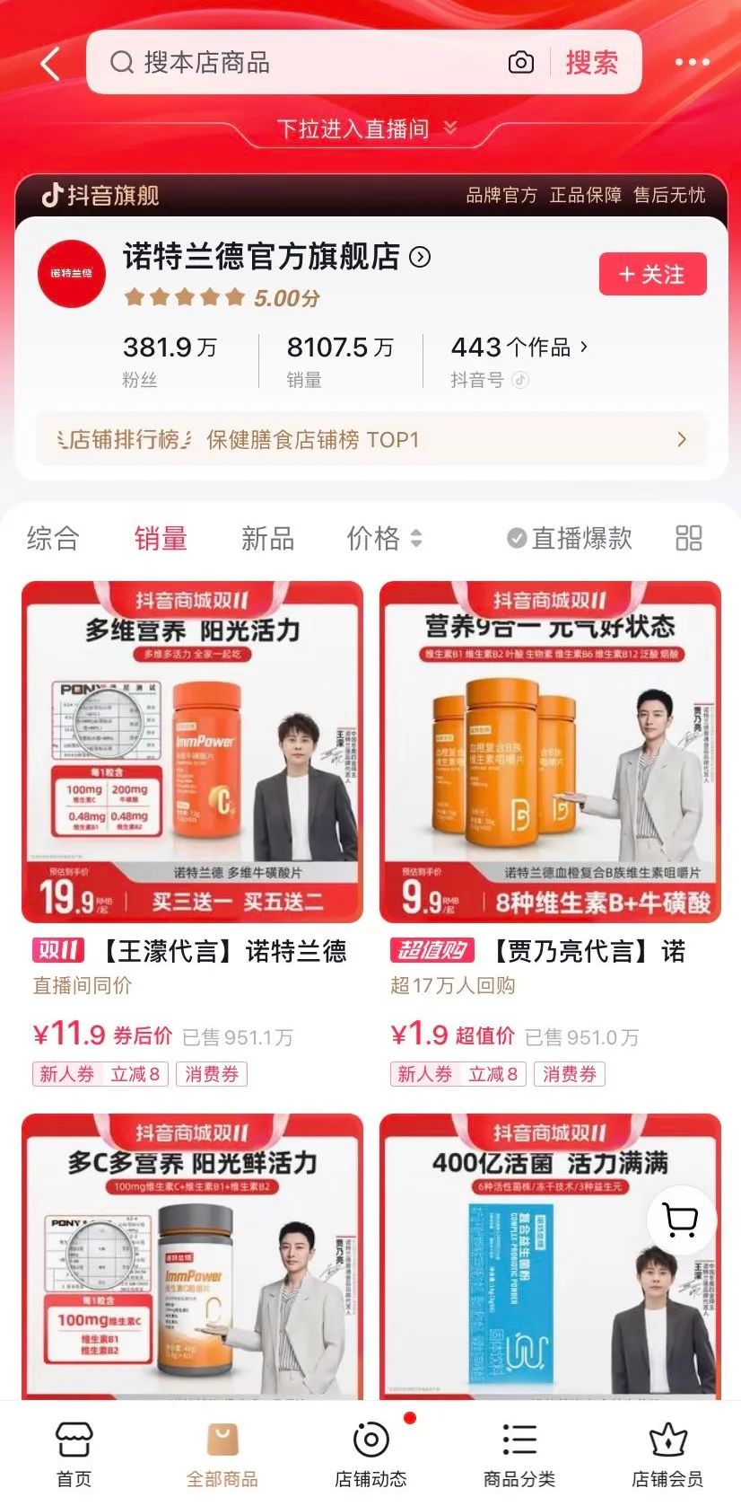 作为抖音电商保健品品类的头部品牌,诺特兰德已经在抖音上线包括基础营养、健身健美、竞技体育、体重管理、女性系列、益生菌与肠道在内的6大品类,共计上市200+款成熟产品,600+个SKU。