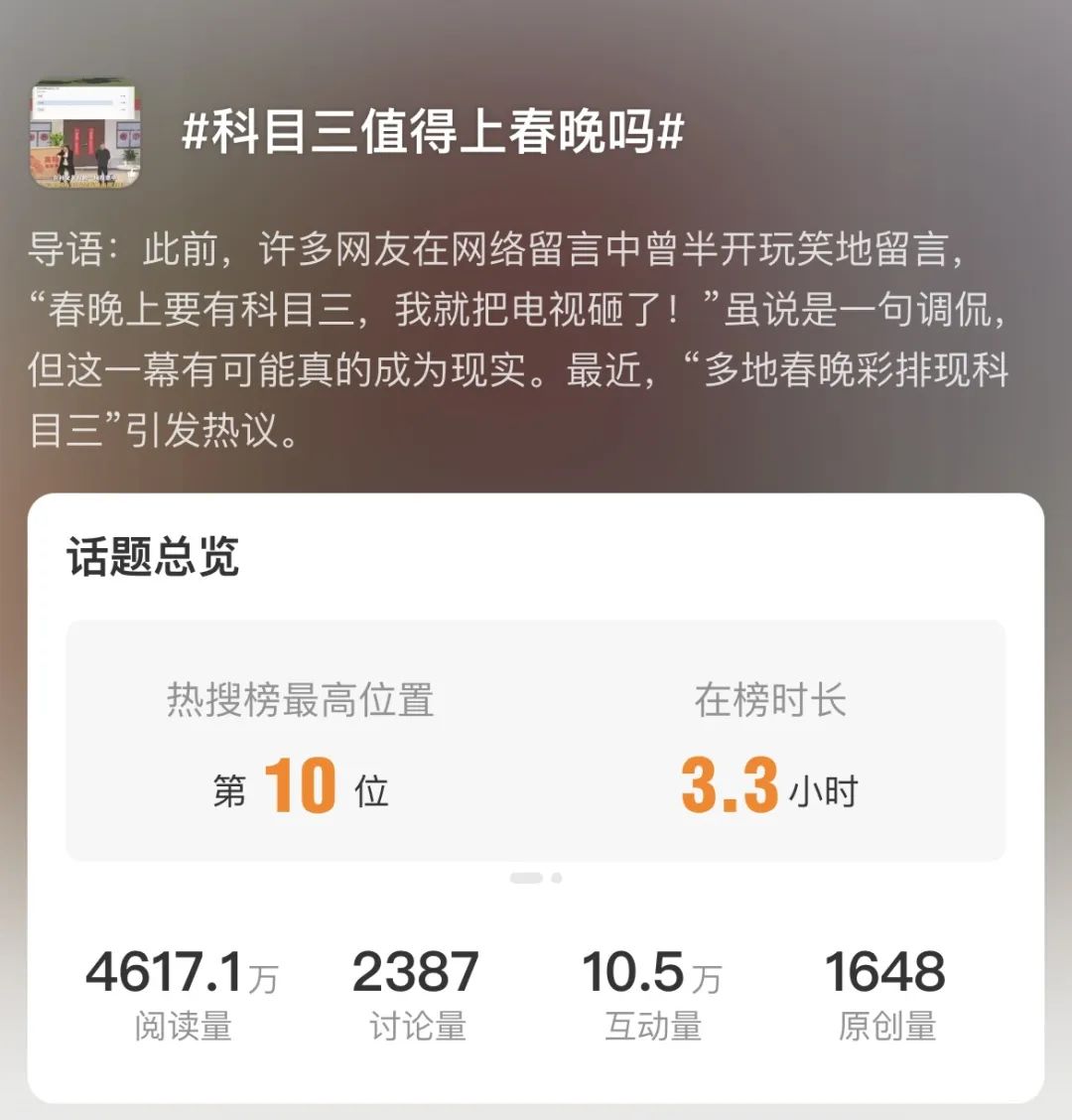“科目三”有多火?除了全网数百亿次的播放外,在地方卫视春晚中,一度流传出“科目三”要上卫视春晚等消息。