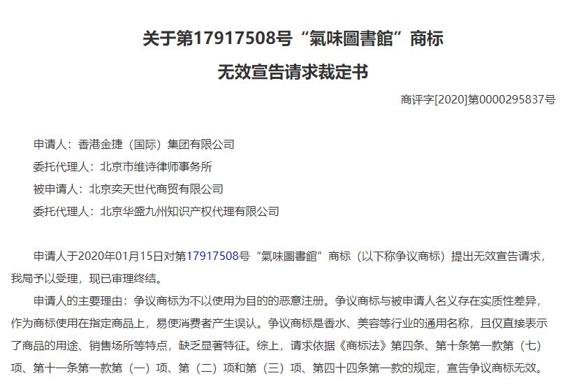 曾经的国货香水TOP 1品牌,或面临着被改名的危机。日前,青眼号外从国家知识产权局获悉,气味图书馆关联公司北京奕天世代商贸有限公司(以下简称:奕天公司)所申请的“气味图书馆”第3类注册商标被宣告无效。