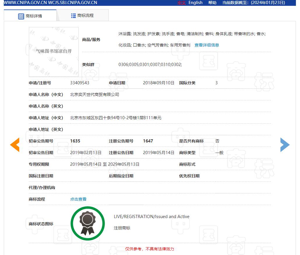 据国家知识产权局发布的公告显示,注册号为“17917508”,商标名为“气味图书馆”的第3类注册商标于2024年1月6日被宣告无效,宣告无效的项目涵盖第3类商标的所有商品/服务。
