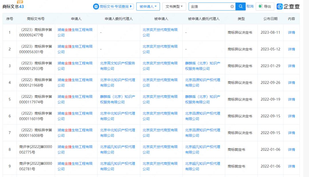 青眼号外发现,也是从2020年起,与金捷公司拥有统一法定代表人的“湖南金捷生物工程有限公司”(以下简称:湖南金捷),针对奕天公司注册的商标,至少发起了30次异议,或是申请已注册商标宣告无效,或是申请驳回奕天公司正在注册中的商标。而湖南金捷的大多数异议,均得到了国家知识产权局的部分认可。
