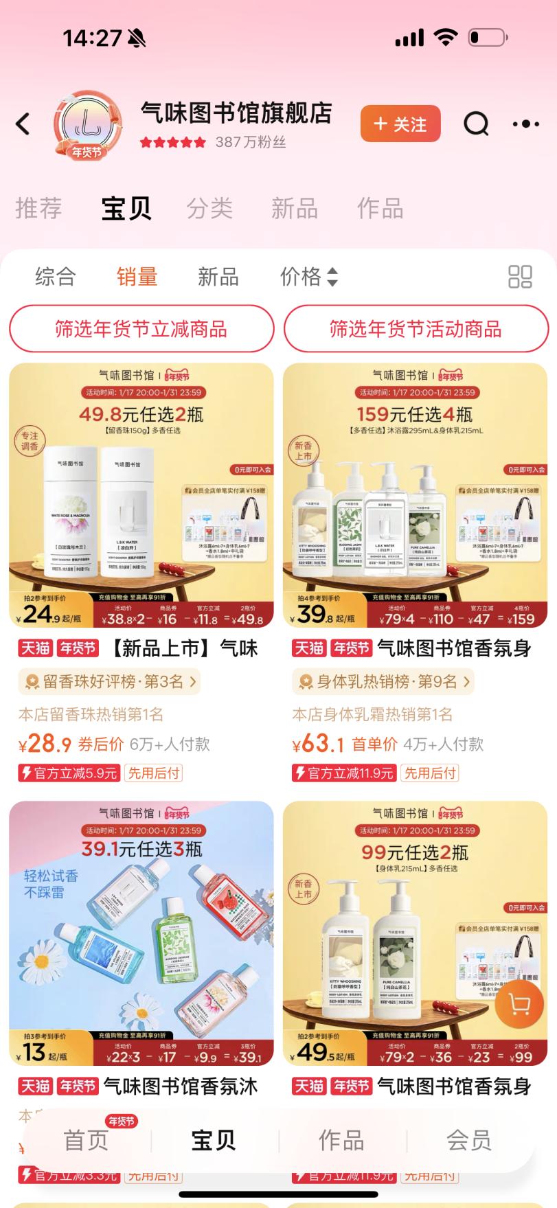 青眼号外检索淘宝气味图书馆旗舰店发现,目前,该品牌店铺已累计粉丝387万,并形成了以香水、家居香氛、香氛洗护、香氛礼盒为核心的多品类布局,产品售价在20-300元不等。其中,旗舰店销量较高的产品有“香薰护衣留香珠”、“香氛沐浴露”等,销量突破10万+件。