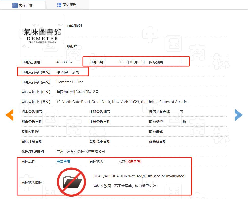 但好在,据国家知识产权局信息显示,目前在涉及“气味图书馆”名称的第3类商标中,有奕天公司和德米特F.L.公司两位申请人,而德米特F.L.公司仅在2020年进行了一次商标申请,但后被驳回,商标状态为“无效”。