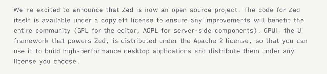 Zed 代码库将采用 Copyleft 许可证,其中编辑器部分使用 GNU General Public License (GPL),服务器端组件则采用 Affero General Public License (AGPL)。此外,GPUI UI 框架将以 Apache 2 许可证分发,允许开发者构建高性能桌面应用程序,并自由选择许可证分发其应用。此次开源转变意味着 Zed 的代码和相关组件将面向所有开发者开放,赋予社区更大的灵活性和合作空间。