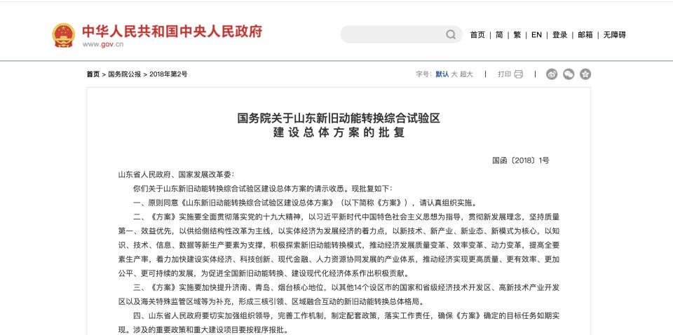 国务院批复同意山东省人民政府《新旧动能转换综合试验区建设总体方案》