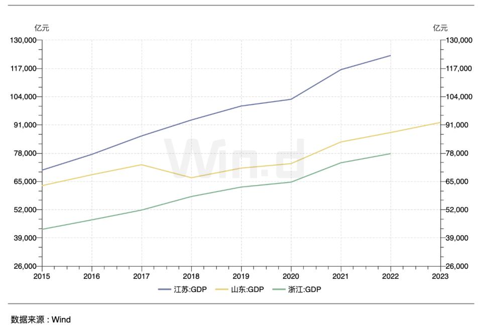 1986年,山东失去了“经济第一省”的称号。2007年,江苏超越山东,坐稳第二把交椅,而山东在跌落到全国第三的位置后,与第二名江苏的差距逐年扩大。2009年,山东与江苏的GDP总量相差不到1000亿元,但到了2022年,两地差距已经被拉大到超3万亿元。