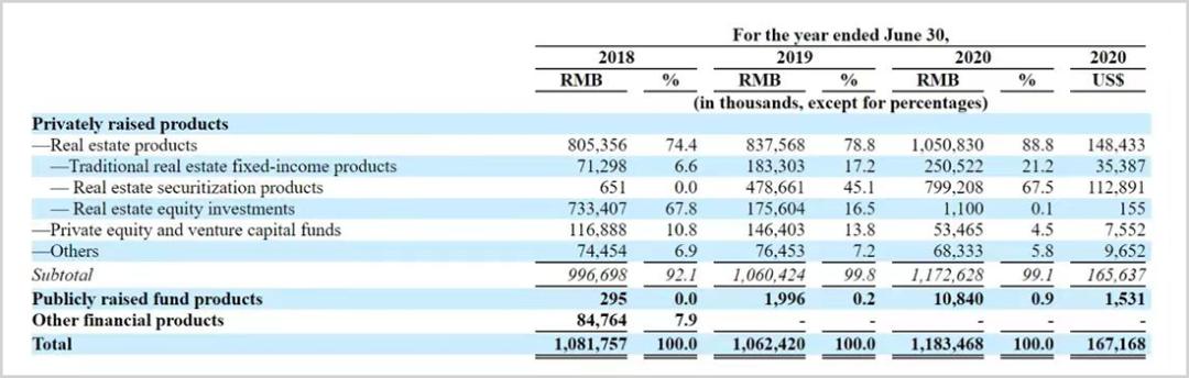 海银财富之前的大多数产品都是地产项目,据海银控股财报,2018-2020财年,海银财富主营业务财富管理收入分别为人民币10.82亿、10.62亿、11.83亿,其中私募房地产产品收入8.05亿、8.38亿、10.51亿,占比分别高达74.4%、78.9%、88.8%。