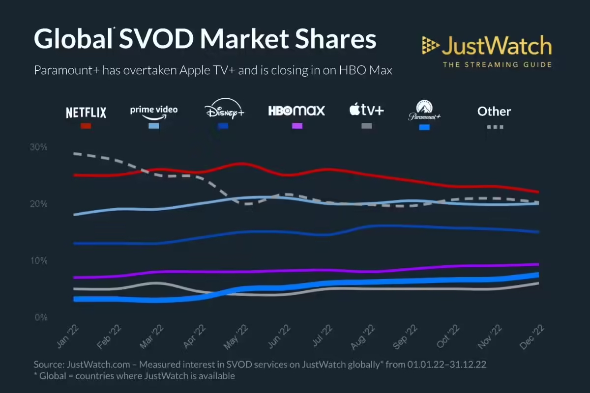 其次,用户数和营收方面,由于苹果官方未公布过确切的数据,我们无法做出精准的判断。来自德国的流媒体聚合搜索平台JustWatch,曾公布过2022年的市场报告。这份数据显示,在全球流媒体视频平台,网飞的市场份额为23%、亚马逊为20%,而苹果仅有5%。
