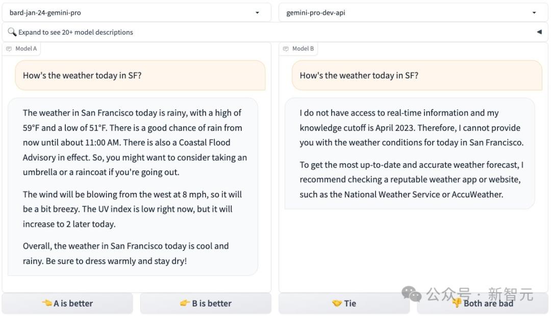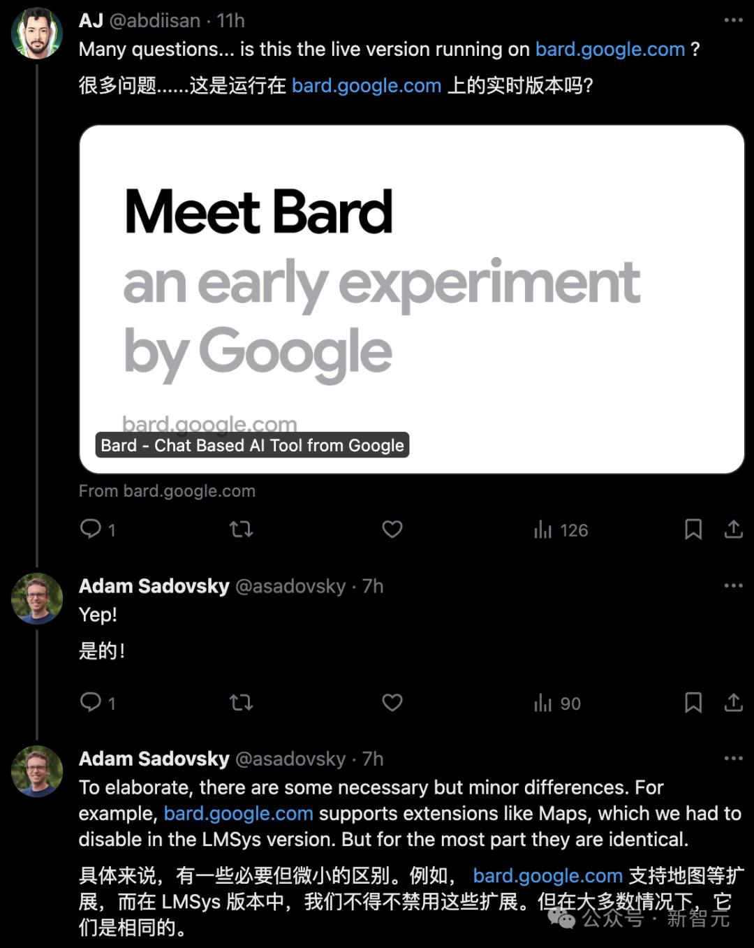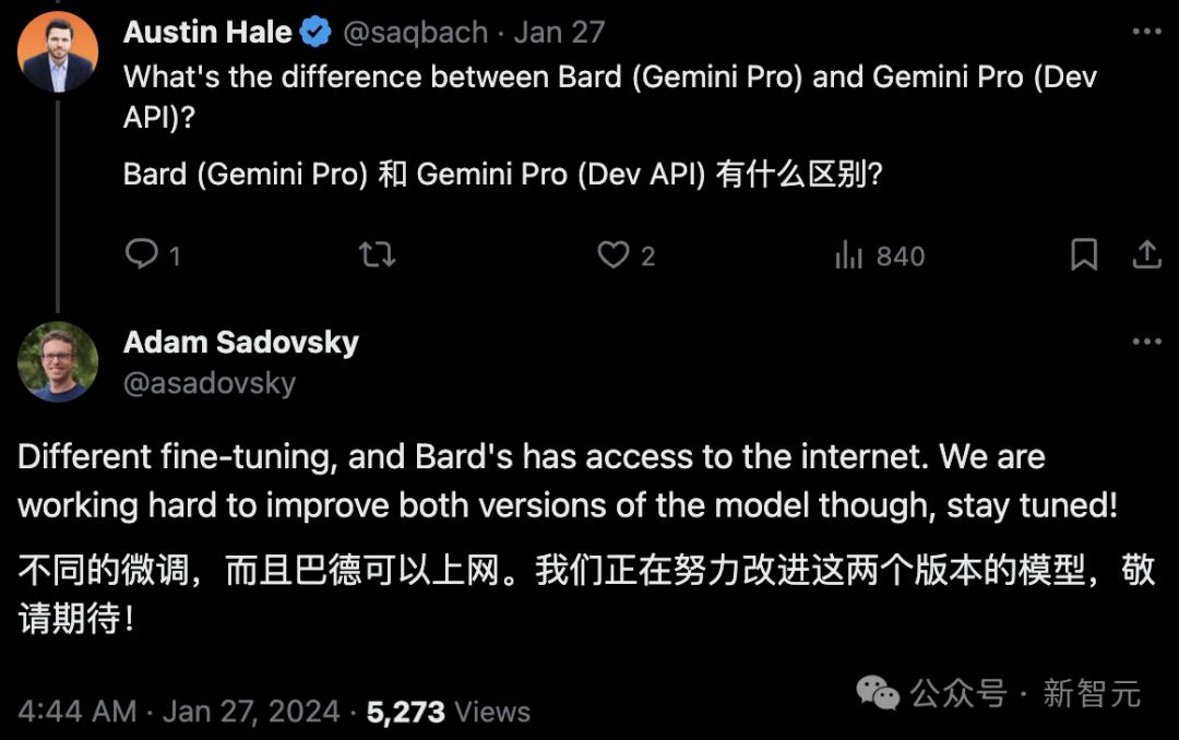 同时,谷歌Bard项目的高级总监Sadovsky也透露,排行榜上的Bard和Gemini Pro(API)是两个在微调层面不同的模型,而且Bard可以检索互联网上的信息。