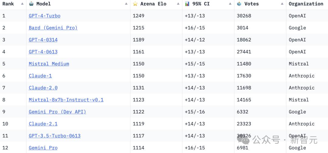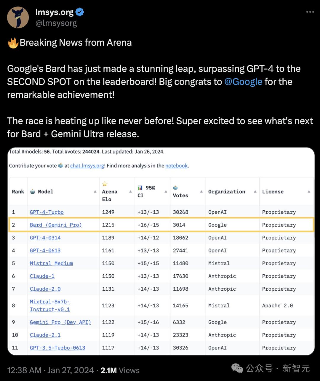 可以看到,在最新的Gemini Pro-scale加持下,Bard直接蹿升到了排行榜第二名的位置。