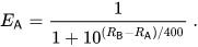 具体来说,如果玩家A的评分为Ra,玩家B的评分为Rb,玩家A获胜概率的精确公式(使用以10为底的logistic曲线)为: