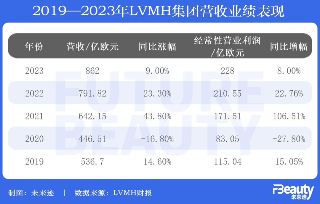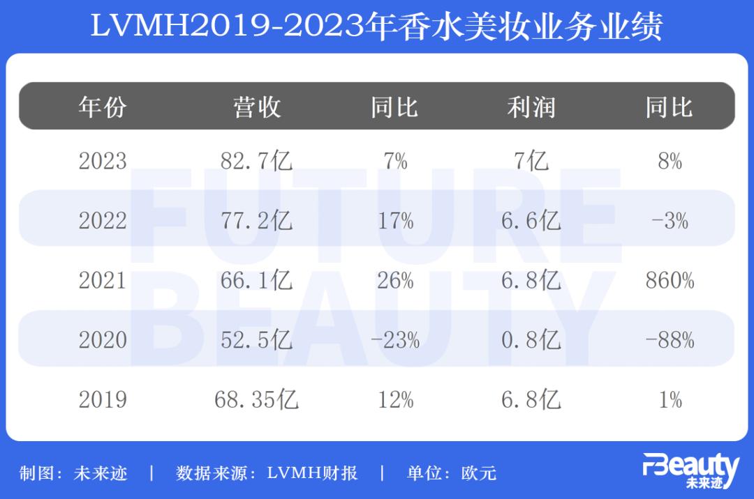 2023年LVMH的香水美妆业务还算稳扎稳打,营业收入及利润分别增长7%、8%,尽管营收增幅相较前两年有所下降,但这也是LVMH的香水美妆业务营收首次突破80亿欧元,利润额也首次突破7亿欧元。