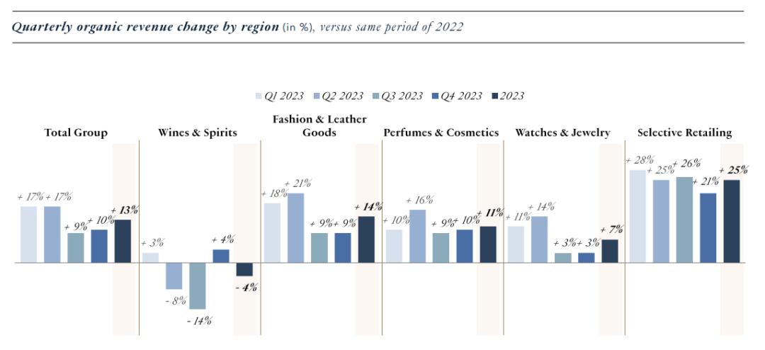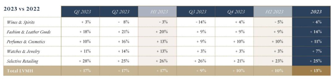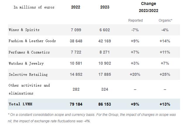 就不同部门业绩情况来看,除葡萄酒等酒类业务以外,LVMH其他主要业务2023年的有机营收均强劲增长。该酒类业务全年收入同比下跌7%至66亿欧元,有机收入下跌4%,营业利润减少2%至21亿欧元。