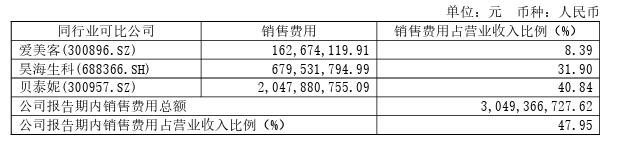 然而,从服务B端客户到服务C端市场的转变,意味着华熙生物需要重新构建消费者认知,背后自然需要燃烧的经费,从2022年年报来看,华熙生物的营销费用占营收比重近半,远远高于同行业可比公司。