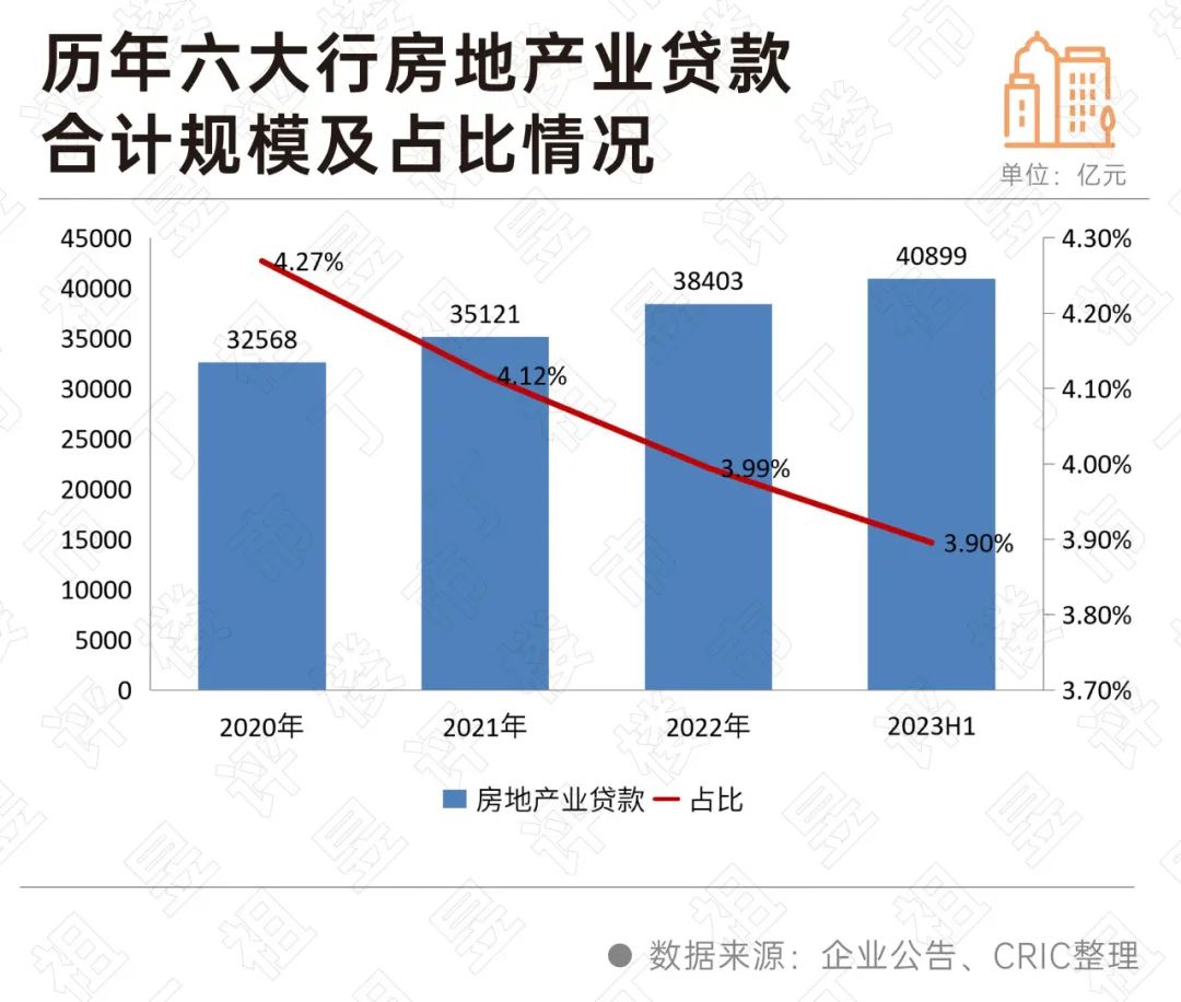 由于房地产贷款增速要远低于总贷款,六大行的房地产业贷款在总贷款中的占比也在持续压缩。2020年六大行的房地产业贷款占比还能达到4.27%,2023年上半年已逐步下降至3.9%。
