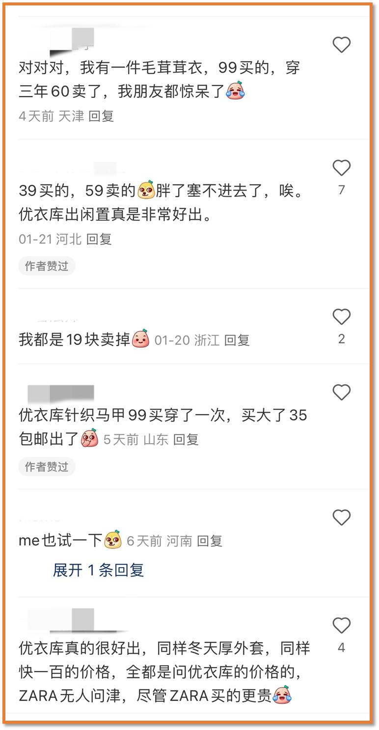 他把这个疑问在小红书发起话题,3天收到120条留言回复,才发现原来在闲鱼上卖二手优衣库的不是他一个,同时也有相当数量的留言来自买家,解释自己为何愿意穿别人穿过的优衣库。