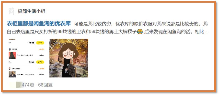 在豆瓣上,有一位用户也留言发起话题:衣柜里都是闲鱼淘来的优衣库。该帖子目前共收获474个赞,327个收藏,68个回复。