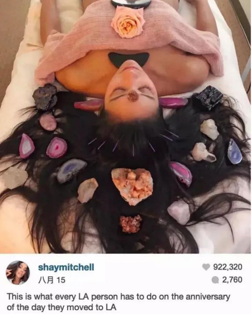 被称为“每个洛杉矶人在他们搬到洛杉矶的周年纪念日必须做的事情”,就是在身上摆满水晶进行冥想。