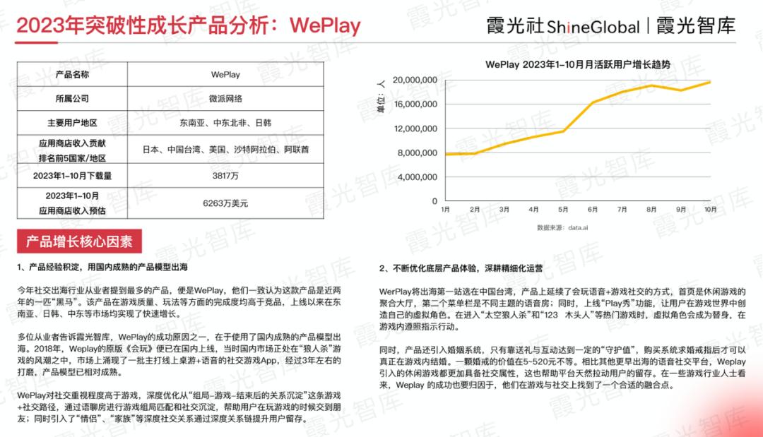 今年,社交出海行业从业者提到最多的产品,便是WePlay。业内一致认为,这款产品是近两年的一匹“黑马”。该产品在游戏质量、玩法等方面的完成度均高于竞品。上线以来,其在东南亚、日韩、中东等市场均实现了快速增长。