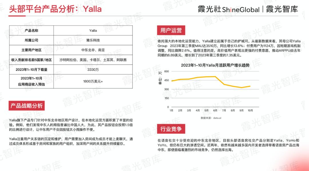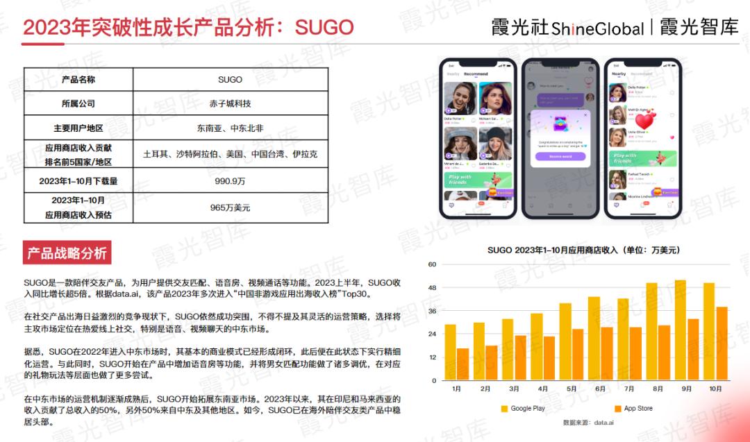SUGO是一款陪伴交友产品,为用户提供交友匹配、语音房、视频通话等功能。2023上半年,SUGO收入同比增长超5倍。根据data.ai,该产品2023年多次进入“中国非游戏应用出海收入榜”Top30。在社交产品出海日益激烈的竞争现状下,SUGO依然成功突围,主要得益于其灵活的运营策略,选择将主攻市场定位在热爱线上社交,特别是语音、视频聊天的中东市场。