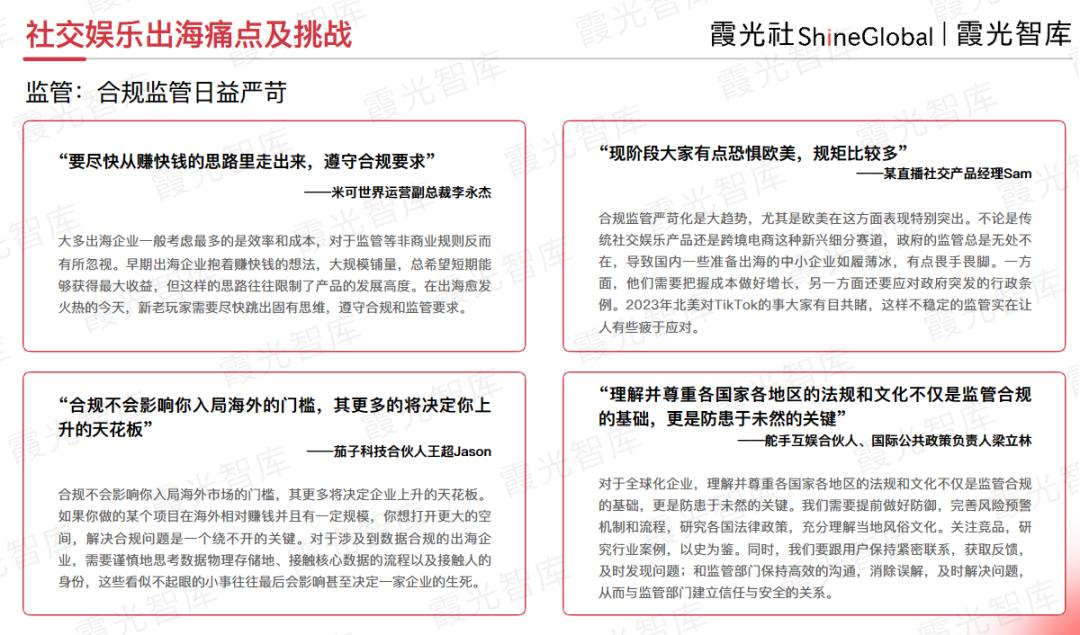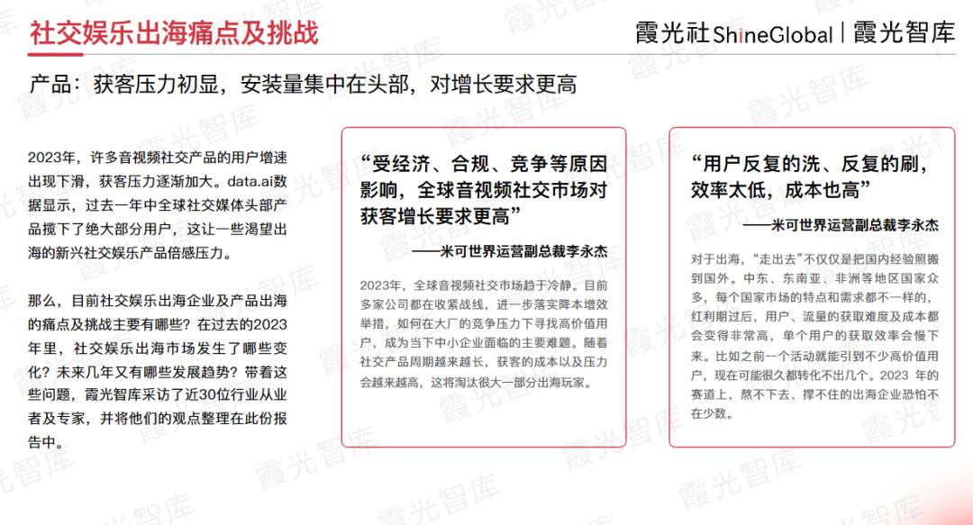 那么,在过去的2023年里,社交娱乐出海市场发生了哪些变化?未来几年又将有哪些发展趋势?带着这些问题,霞光智库对近30位行业从业者及专家进行了访谈,将他们的观点整理到《2024年社交娱乐出海发展趋势洞察报告》中。