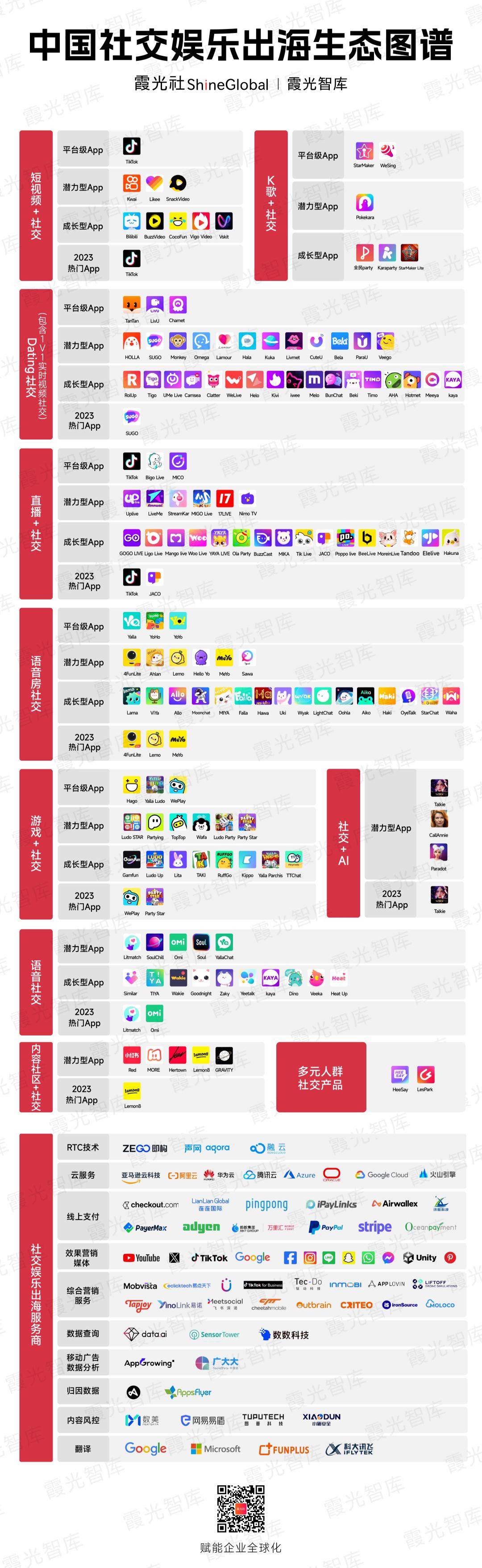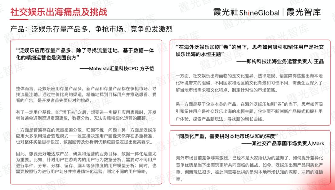 霞光社ShineGlobal旗下咨询服务品牌霞光智库,对2023年中国社交娱乐出海市场发展概况、细分品类市场概况、热门出海产品数据等维度,进行了详细梳理与分析。同时采访了数十位社交出海从业者,总结出过去一年社交娱乐出海行业的变化与挑战,正式发布《2024年社交娱乐出海发展趋势洞察报告》,通过对社交娱乐市场多个维度的解读,为企业带来国际化视野下的出海战略赋能。