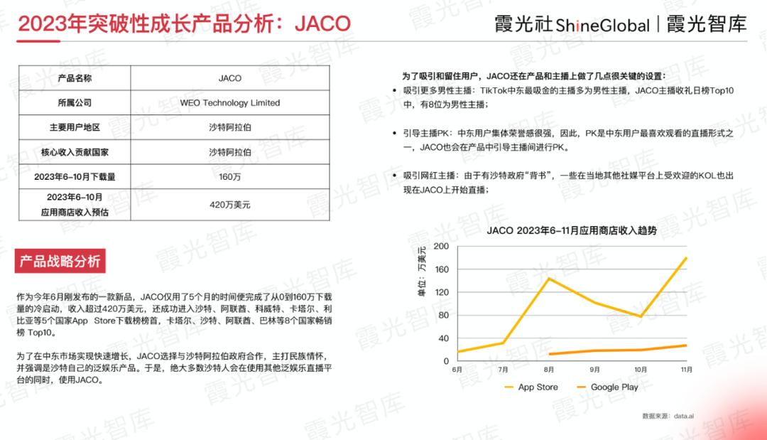 作为2023年6月刚发布的一款新品,JACO仅用了5个月的时间,便完成了从0到160万下载量的冷启动,收入超过420万美元,还成功进入沙特、阿联酋、科威特、卡塔尔、利比亚等5个国家App Store下载榜榜首,以及卡塔尔、沙特、阿联酋、巴林等8个国家畅销榜Top10。