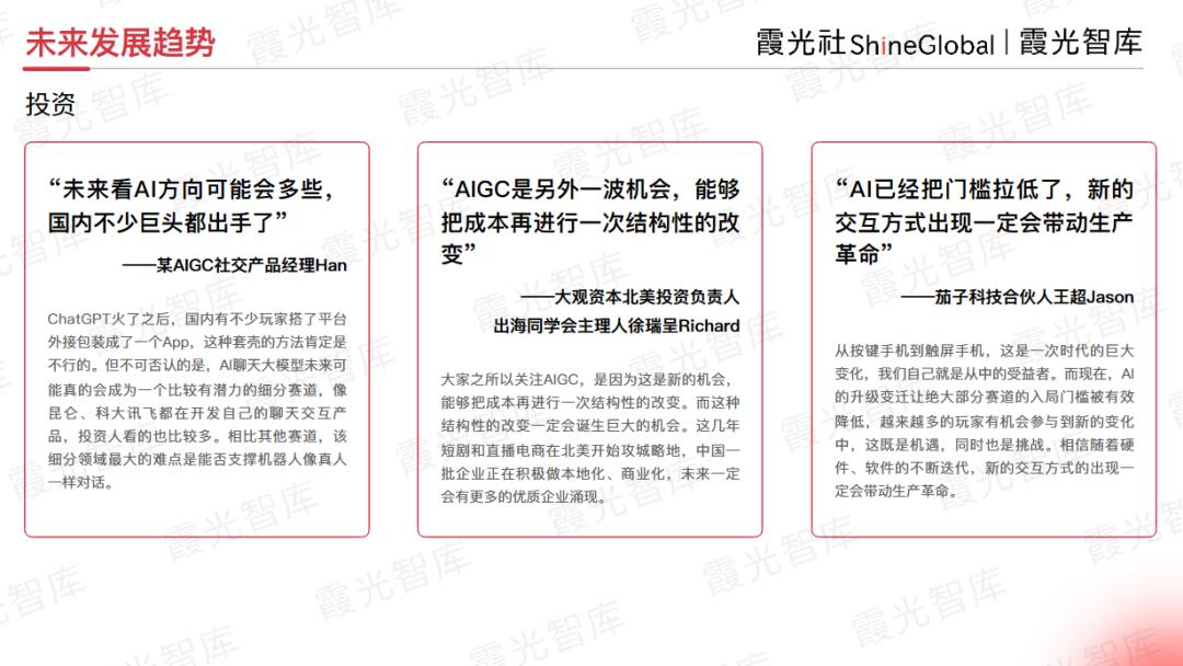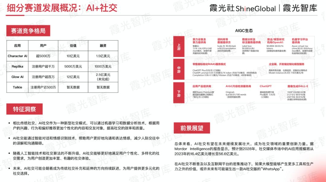 对此,某AIGC社交产品经理Han表示赞同。他强调,赛道未来会更细分,AI是可能相对的大机会,会创造一些新的应用场景和需求。社交娱乐这个赛道发展得相对扎实,出海企业应往细分的地方去挖掘机会。