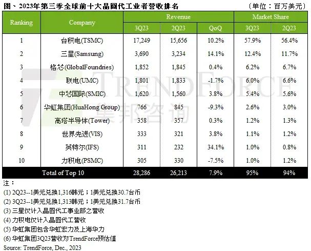 TrendForce集邦咨询数据显示,2023年第三季度全球前十大晶圆代工业者市场份额排名中,前五分别是台积电(57.9%)、三星(12.4%)、格芯(6.2%)、联电(6.0%)和中芯国际(5.4%),而英特尔(1.0%)首次跻身前十,并超越力积电(1.0%),可以看出英特尔发力晶圆代工的野心。