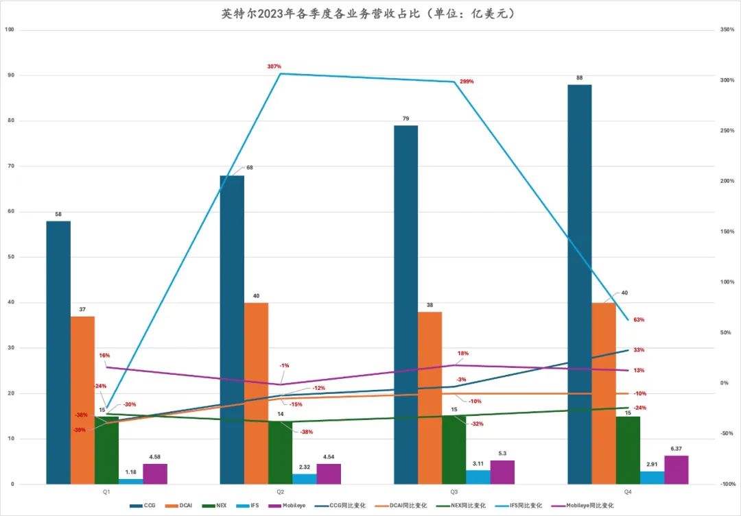 CCG和DCAI分别面向PC处理器市场和数据中心处理器市场。CCG在第四季度实现同比增长33%,前三季度营收分别同比下滑38%、12%、3%,DCAI则从第一季度到第四季度分别同比下滑39%、15%、10%、10%。