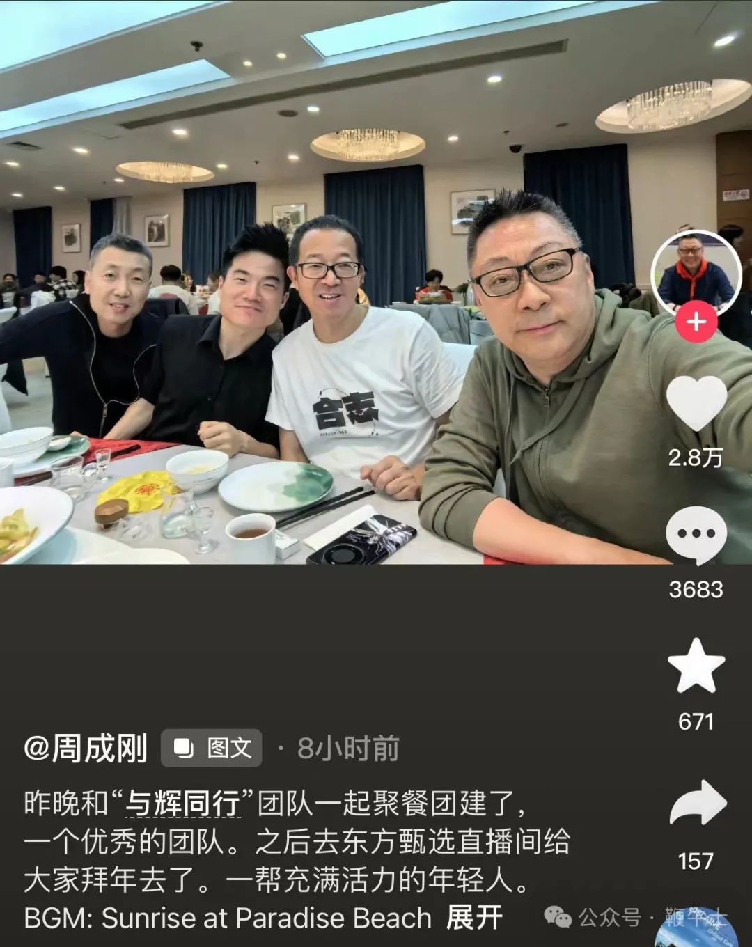 从昨日的视频来看,俞敏洪乘坐高铁赶回北京,先参加了与辉同行的团建,又和新东方教育科技集团CEO周成刚、董宇辉一起入场,出现在东方甄选年会上。