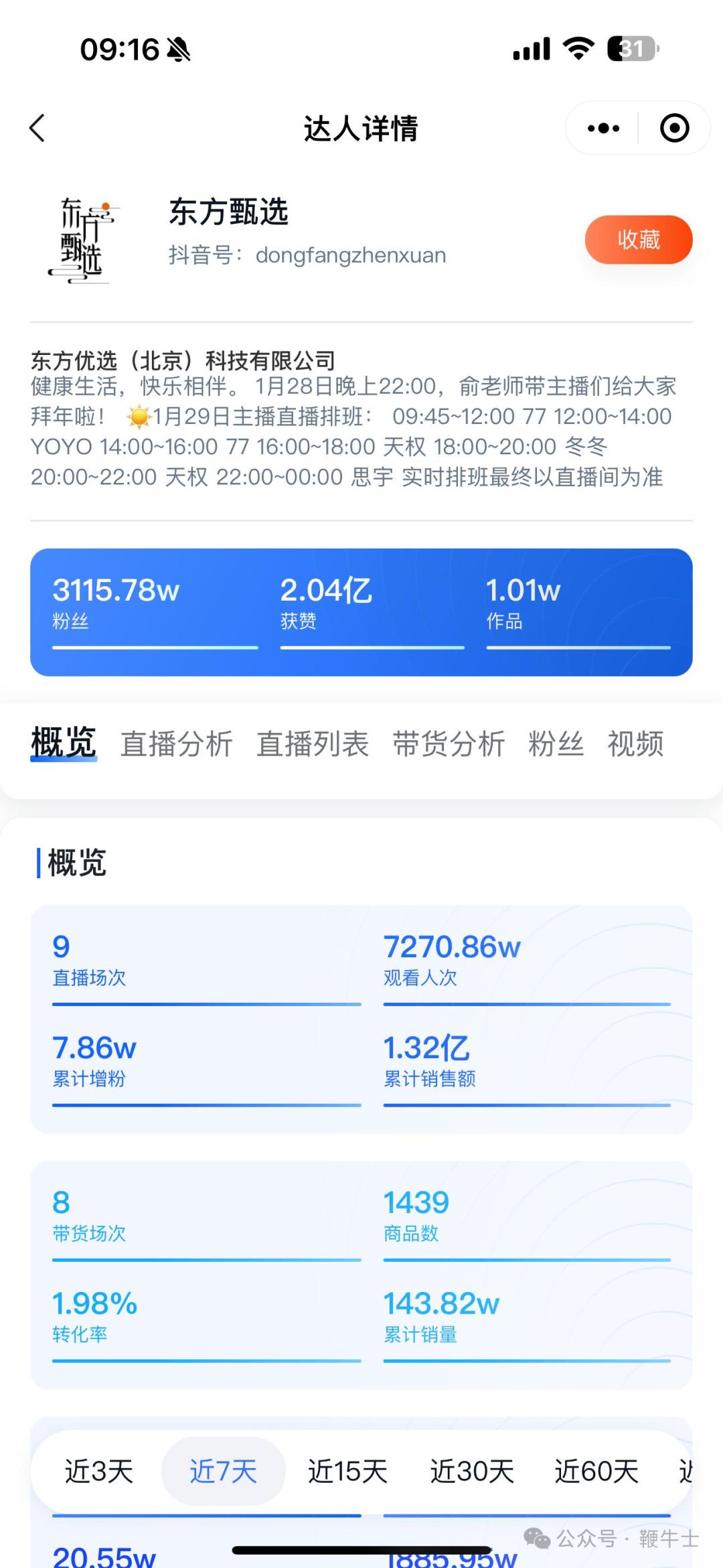 鞭牛士根据三眼查Pro整理了上周(1月22-1月28日)与辉同行和东方甄选的带货数据。