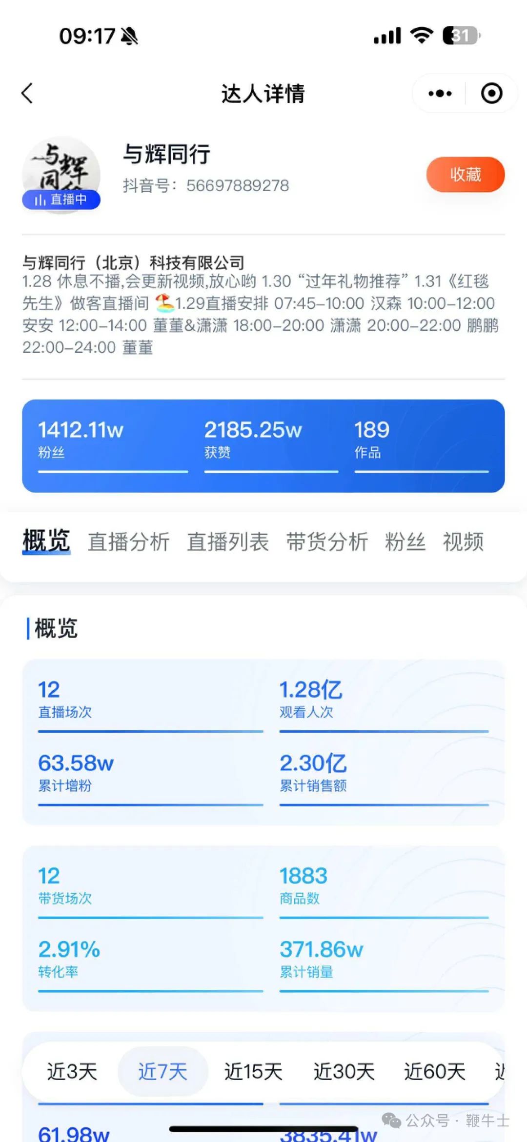 数据显示,与辉同行近7天带货销售额为2.3亿元,场均销售额3835万元。一周增粉63.58万人,观看人数1.28亿人次,直播场次12次,转化率2.91%。