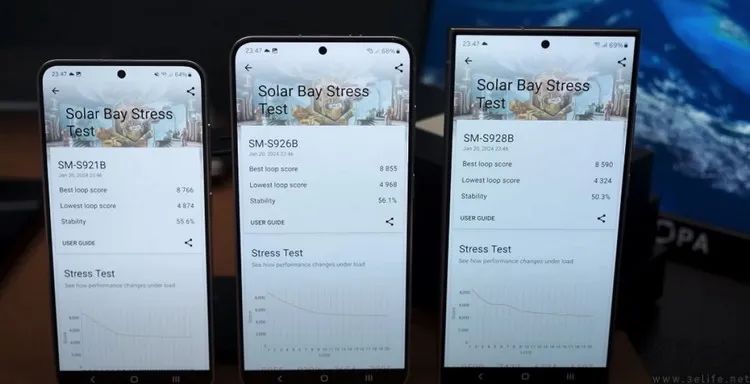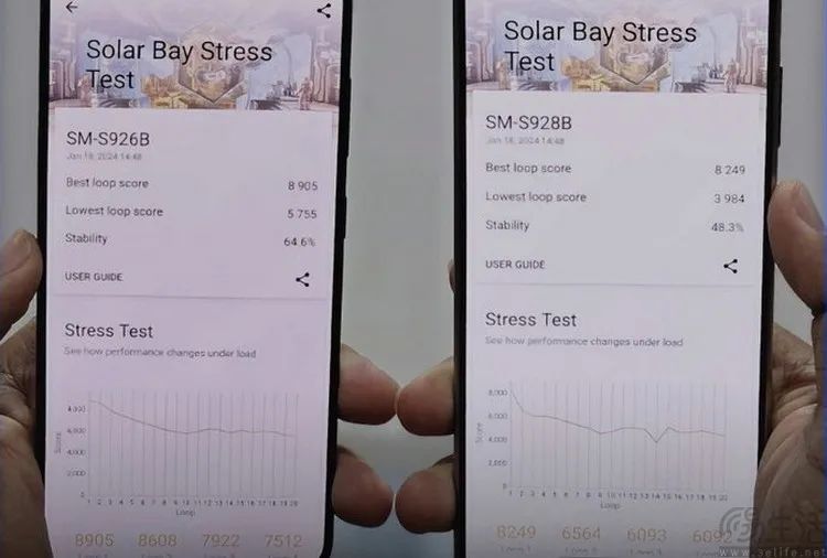 最为重要的是,在一些重负载的持续性能测试中,Exynos 2400的“性能稳定性”甚至表现得比骁龙8 Gen3更好。也就是说,它甚至可能已经解决了过去困扰三星很久的SoC过热和过度降频问题。