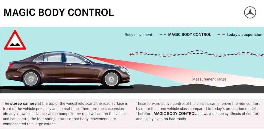 相比之下,奔驰的「魔毯悬架」(Magic Body Control)采取了一种更先进的方法。它使用摄像头预先扫描道路表面,识别前方的凸起和坑洞,并在车辆到达这些地方前,对悬架进行调整。