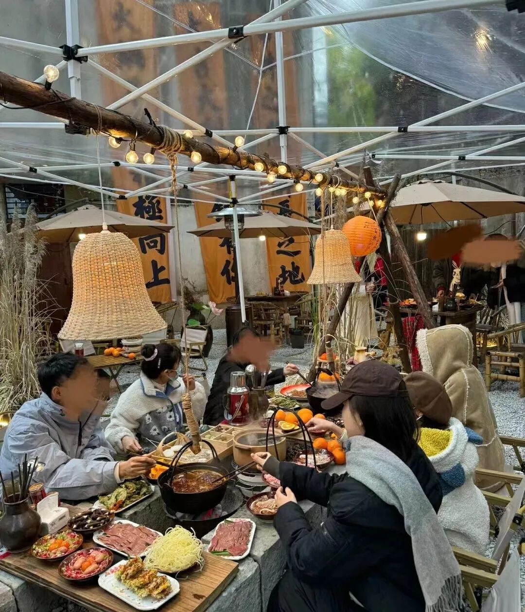 它和围炉煮茶一样,主打氛围感,锅具被粗麻绳吊在半空,石块或红砖还原火塘造型,上面摆放着各式配菜,再搭配上露营风格的装饰、暖黄的氛围灯,满满的闲适、野性感就出来了。