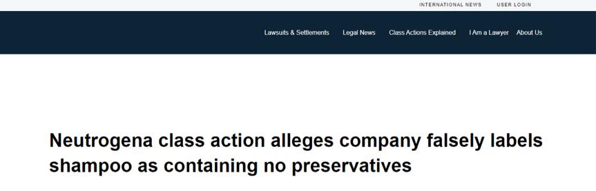 近日,据美国提供有关集体诉讼及和解信息的网站Top Class Actions报道称,一位名为Melissa Gonick的消费者在纽约联邦法院对强生消费者公司(J&J Consumer Inc.)旗下露得清品牌提起集体诉讼,指控该品牌将洗发水产品贴上不含防腐剂的标签。那么,这究竟是怎么一回事呢?