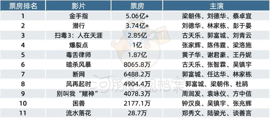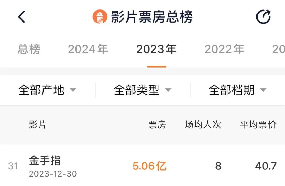 排在第31位的是去年年末上映的《金手指》,该片耗资逾3亿,由庄文强自编自导、有梁朝伟和刘德华两大影帝助阵,票房刚刚5亿,却已是2023年票房最高的港片。紧随其后的是由刘德华监制兼主演的《潜行》,该片成本2亿,票房累计3.6亿,远远没有达到回本的成绩。