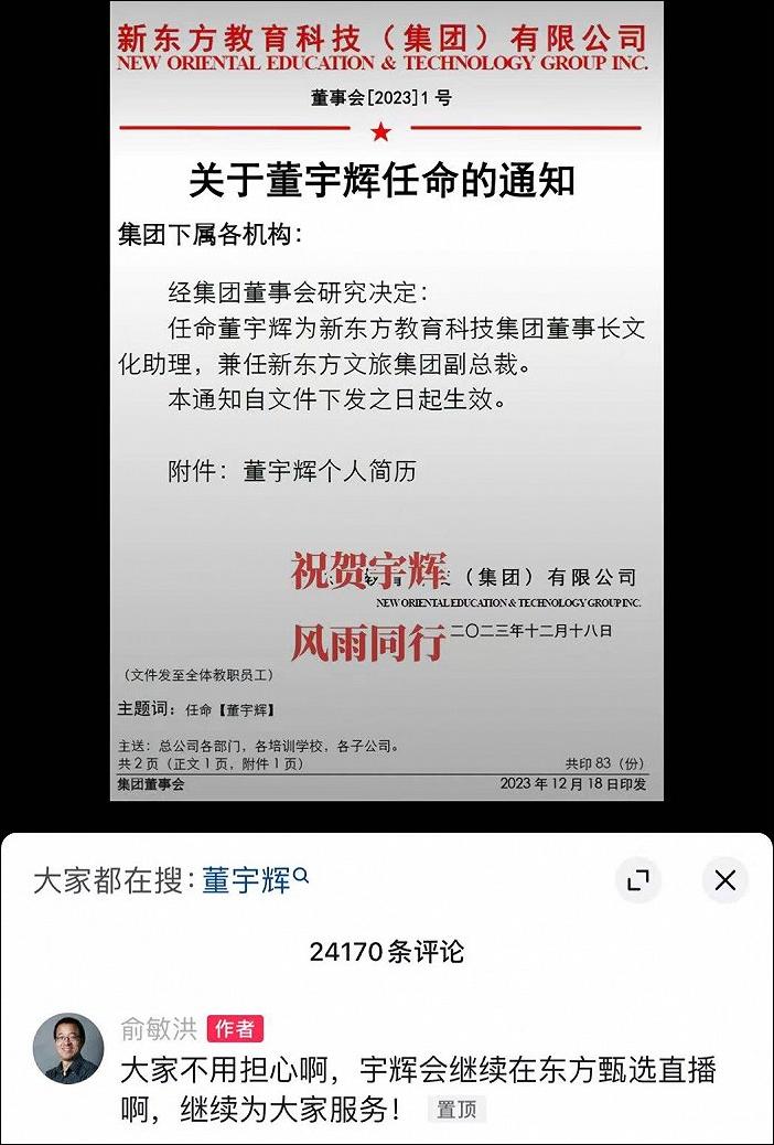 2023年12月,因为多条优质文旅视频的文案是由谁撰写的争论,加重了董宇辉与东方甄选团队之间内部矛盾,并演变到董宇辉粉丝抵制东方甄选。在事件不断激化的情况下,俞敏洪带董宇辉开直播澄清,并做出让董宇辉独立开播的决定。