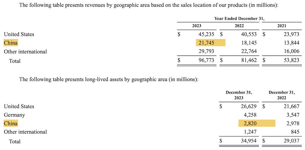 特别的,特斯拉在中国市场表现可观,营收达到217.45亿美元(约合人民币1560亿元),仅次于美国。同时,中国地区的长期资产(为企业经营而非为销售给客户所购的存续期较长的资产)为28.2亿美元(约合人民币202亿元),排名第三。