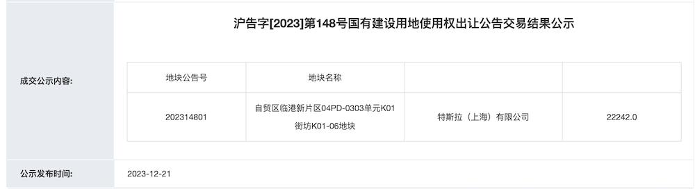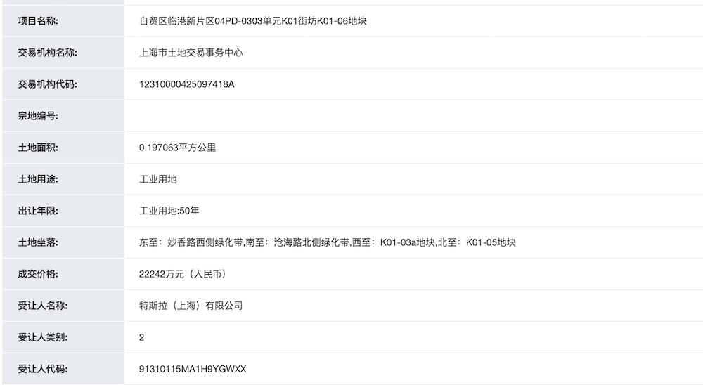 特斯拉是该地块的唯一出价人,出让人为中国(上海)自由贸易试验区临港新片区管理委员会。该地块紧邻特斯拉汽车超级工厂和在建的宁德时代工厂,投资强度不低于1200万元/亩,预计总投资额不低于35.47亿元。
