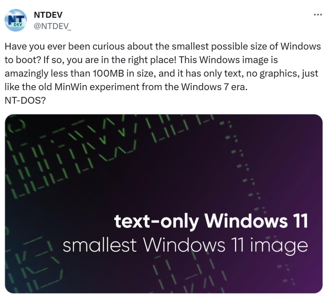 “你是否曾对 Windows 到底能变成多小感到好奇?如果有,那你就来对地方了!这个 Windows 映像的大小竟然不到 100MB,而且只有文本没有图形,就像 Windows 7 时代的 MinWin 一样。”